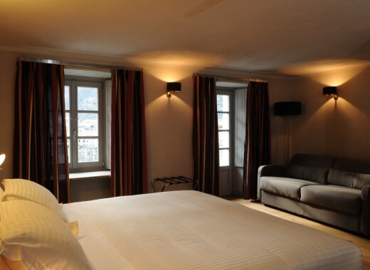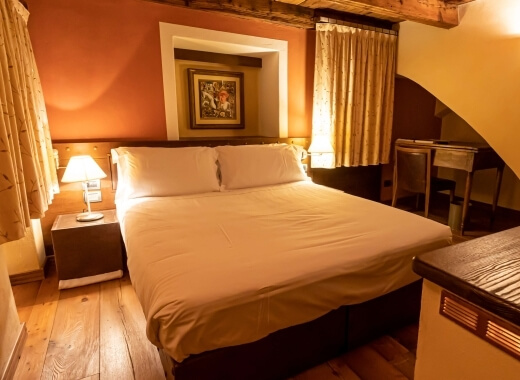 Dotate di balcone o terrazzo, abbaino o soppalco, godono di una panoramica suggestiva ed emozionante e possono contare su servizi e dotazioni tali da regalare un comfort ed un relax impeccabili. Una selezione di camere, di particolare charme, sono ricavate da un’antica casa fortificata che regolava l’accesso al borgo. Affascinanti e tranquille godono della vista indimenticabile sul Forte di Bard.