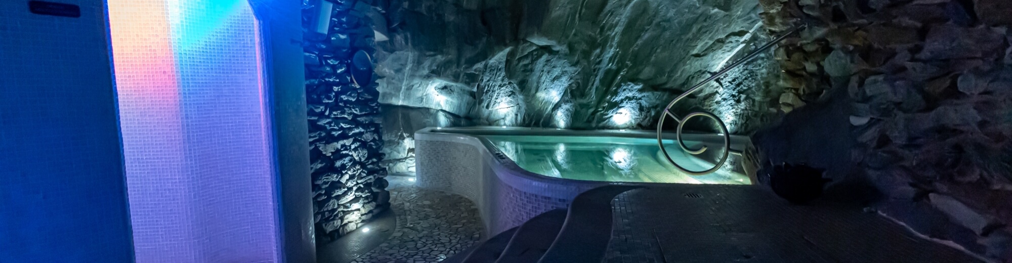 Una grande nicchia naturale, bordata in mosaico, dove abbandonarsi al tocco gentile dell’acqua in movimento oppure godere del getto corroborante di una cascata che, uscendo violentemente dalla parete in roccia, tonifica e scioglie le tensioni.